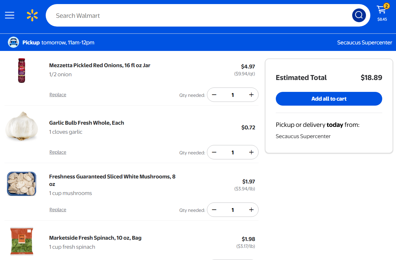 米国でも夕方4時が近づくと主婦の悩みは「夕食何にしよう…」であることは変わりない。この永遠の悩みを解決すべく、スーパーはあの手この手を打ってきた。2012年にブルーエプロンの登場で一気にブームになったミールキットは、1回の食事の献立が予め組まれていて、例えば前菜とパスタ料理とサラダに必要な食材とレシピが箱に入って定期配送するサービスで、それを指示通りに調理すれば見事に栄養バランスあり美味しい食事ができる、というものだ。2018年にウォルマートも参入し、配達ではなく店舗販売向けにアレンジして2人分で$8~$15の食事をパックに詰めて提供した。