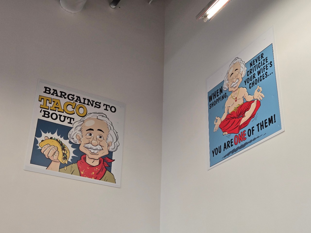 左:「語りたくなるバーゲン」のtalkとタコ(タコスのこと)をひっかけたイラスト 右:座禅中の僧侶が「買い物をする時は決して妻の選んだものを批判してはいけない。あなたも、だ」という諭しているイラスト