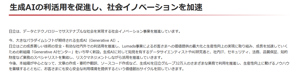 ○ 参考: 「Generative AIセンター」の立ち上げから1年、日立幹部が語る現在(ZDNET) - 西松建設